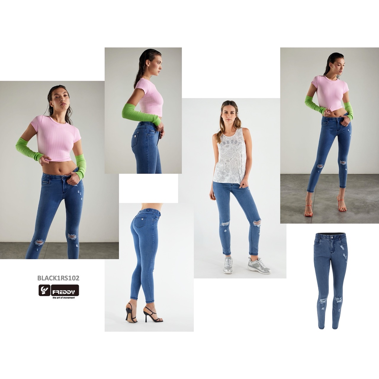 新シリーズ、クラシカルなFREDDY BLACK LABELのNEWモデルジーンズダメージタイプ。ダメージ加工がされたストレッチ デニムとシャトル デニムの使用により最高の快適さを提供し、リベット、ボタン、内側のゴム、フレディのロゴ、厳密なジッパーなどのすべてのディテールが特徴的な 5 ポケットのFREDDY BLACK モデルのジーンズです。 このモデルは、ベルト ループと内側にゴムが付いたレギュラー ウエスト、メタル製のボタンとジッパーで開閉するレギュラー丈、体のラインに心地よくフィットするスリムなフィット感を提供します。 スタイリッシュなダメージが特徴の、卓越したライフスタイルアイコンの本物のスピリッツが際立つ快適なデニムです。