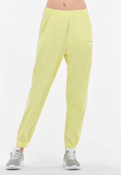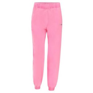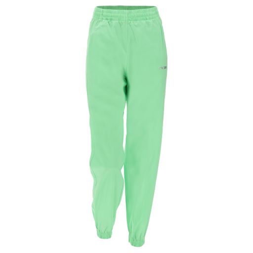 コットンとエラスタン少し入ってますがこちらは伸縮性無いシャカシャカした風合いのパンツです。ネオンカラーに染められた衣服、ウエストと足首にゴムバンドが付いています。 このモデルは快適なフィット感があり、前面にウェルトポケットが付いています。