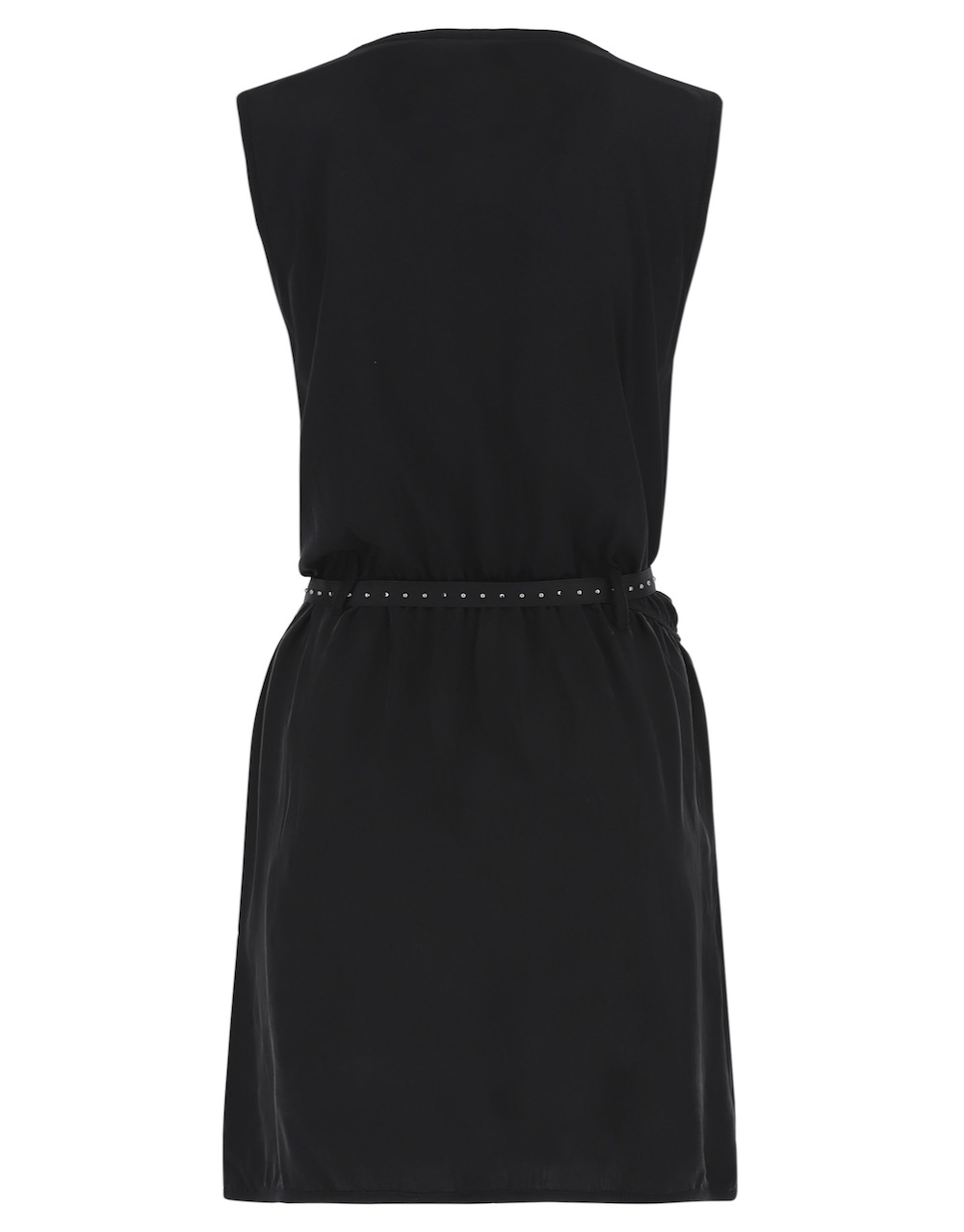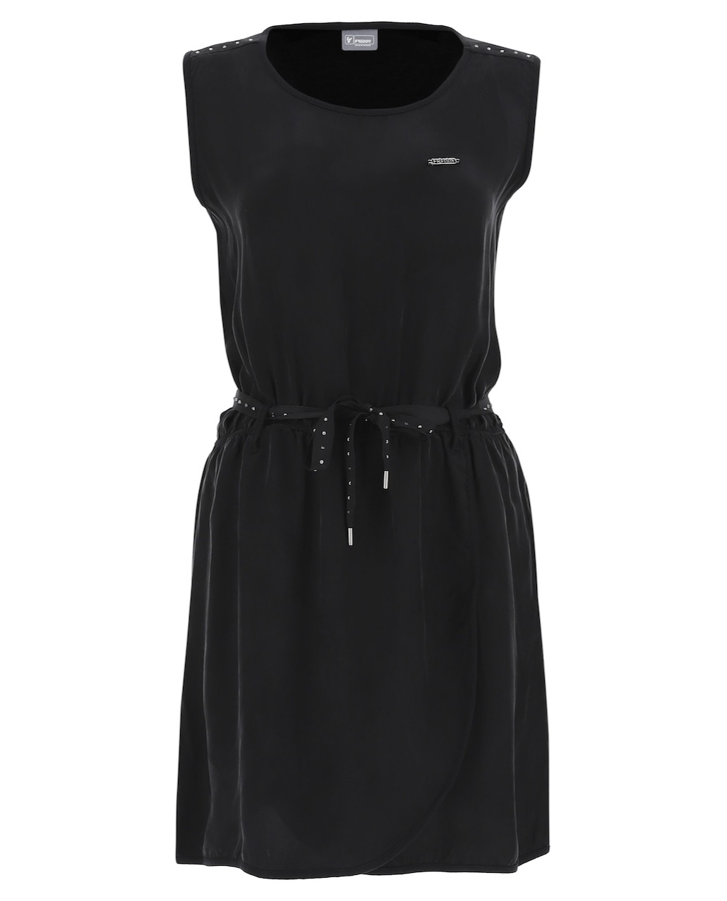ソフトで光沢のあるキュプラを使用したレギュラーフィットのノースリーブドレスです。植物性繊維で、シルクのような肌触りがあり、柔軟性と爽やかさが特徴です。ワイドなラウンドネック、ベルトループ付きのギャザーウエスト、ラインストーンとスタッズをあしらった同系色のベルトは結ぶことができ、スカートは巻きスカートになっています。肩には、ラインストーンとスタッズを並べた共布のリボンをあしらい、華やかなディテールを完成させました。FREDDY・ムード満点で、快適さとスタイリッシュさを謳歌するのに最適な、フレッシュで心地よい一着です。