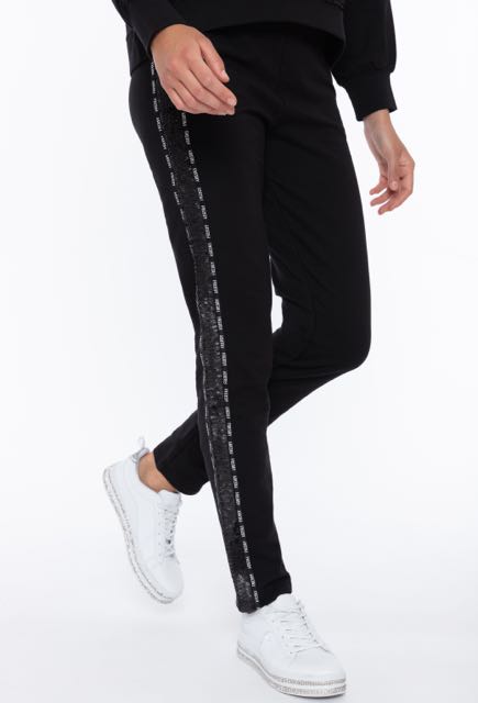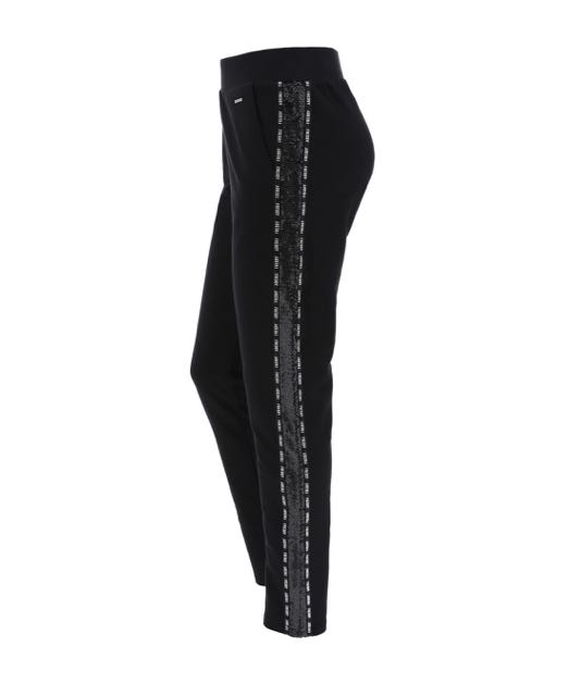 裾がストレートのストレッチブラッシュドフリースロングパンツで、FREDDYブランドのロゴで縁取られたスパンコールのサイドバンドで装飾されています。
